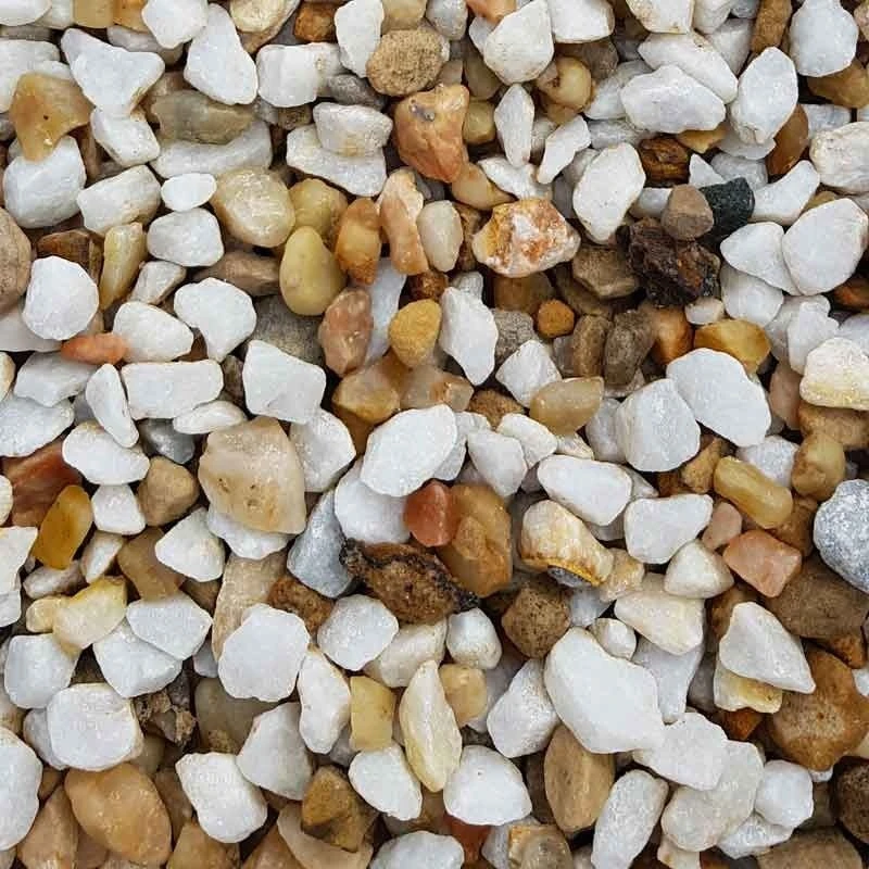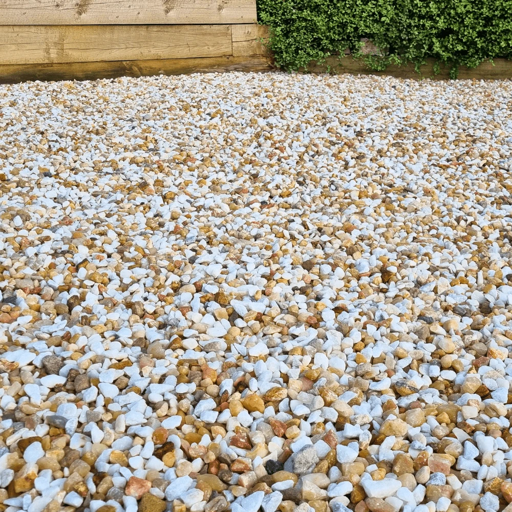 This nice angular 20mm down chipping mixed with a rounded buff stone is a great size for walking or driving on.  Looks beautiful in water features and to set off your planters and borders or along side our natural stone paving.  This is a beautiful blend of white, orange, honey, gold, blacks and creams creating a unique, striking finish.