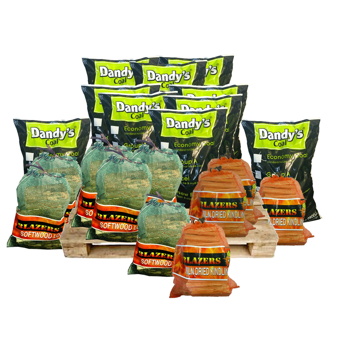 Large Bundle: 10 x 15kg bags coal (see options), 6 x nets softwood kiln dried logs, 4 x nets of kindling sticks.